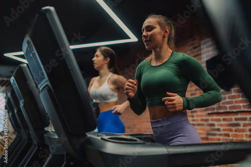 © Zamrznuti tonovi, Obraz premium Two young women running on treadmills in modern gym