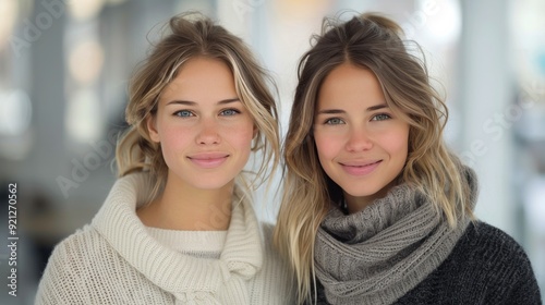 © olegganko, Obraz premium Two Young Women Smiling Together in Cozy Sweaters Indoors on a Bright Day