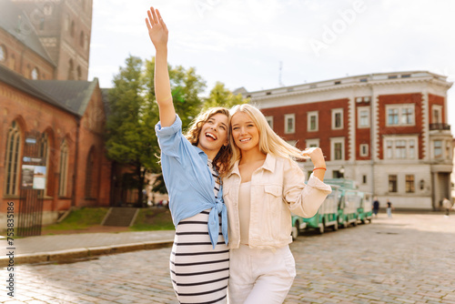 Naklejka premium Two young women walk along the city streets. Female tourists in bright dress enjoys sights of the city on sunny day. Concept of lifestyle, fashion, travel.