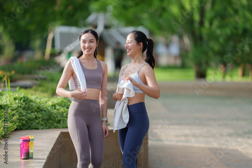 Naklejka premium Two young women walking and talking after exercising in park