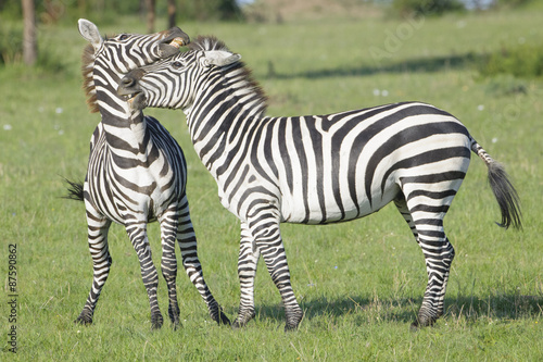 © andreanita, Fototapeta premium Two Zebra (Equus quagga) stallions fighting on savanna, Serengeti National Park, Tanzania