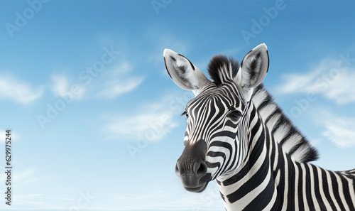 Naklejka premium Two zebras embracing.A serene moment in a Zebra herd as two family members rest their heads on each other. striped cape donkey in the blue sky with copy space