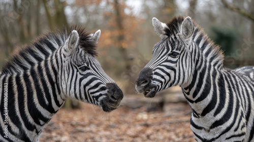 © dominic, Fototapeta premium Two zebras facing each other in a natural forest environment with fallen leaves on the ground and blurred trees in the background during autumn season