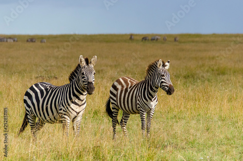 Naklejka premium Two zebras grazing on the green pasture inside Masai Mara National Park during wildlife safari