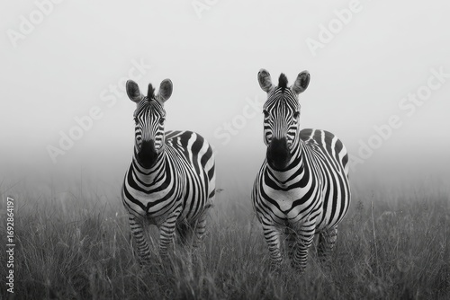 © Kim, Fototapeta premium Two zebras in a misty field, monochrome