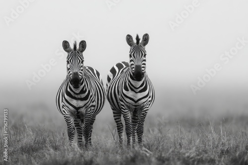 © jemy, Fototapeta premium Two zebras in monochrome. A grayscale image of two zebras facing forward in a grassy plain. The light is soft, suggesting a misty or foggy morning. The animals are centered, with a neutral backdrop