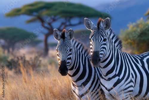 Fototapeta premium two zebras in the savannah at sunset, standing under an acacia tree with tall...