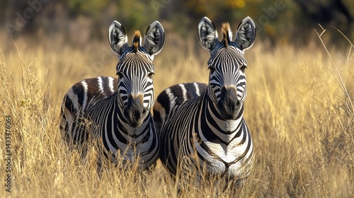 Fototapeta premium Two zebras in the savannah on a background of golden grass. Suitable for educational materials, articles about wildlife.