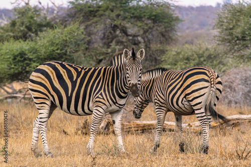 © AventuraSur, Fototapeta premium Two zebras (one looking to camera) at Kruger National Park, South Africa