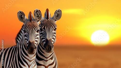 Naklejka premium Two zebras stand close together against a vibrant sunset, their black and...