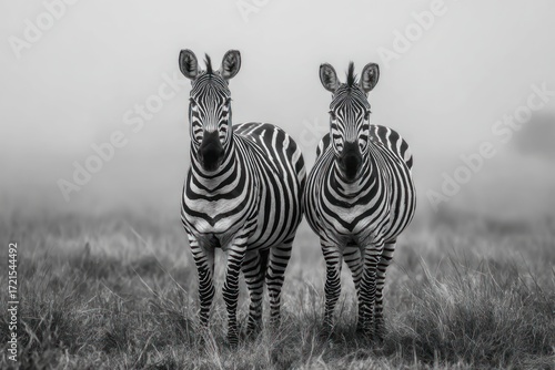 Fototapeta premium Two zebras stand in a field shrouded in a hazy monochrome mist, their distinctive stripes sharply defined against the muted background.