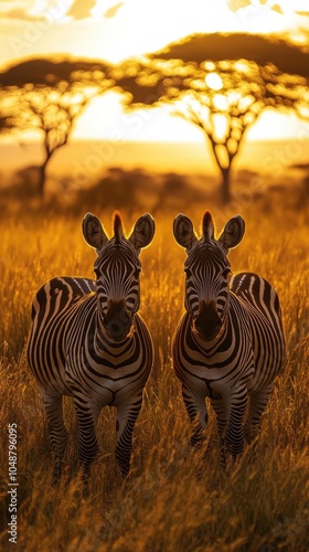 © BloomArt, Obraz premium Two zebras stand in a grassy field at sunset, looking directly at the camera.