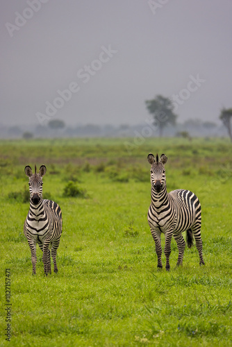 © DriveAndDive, Fototapeta premium Two zebras stand in a lush green field under a cloudy sky.