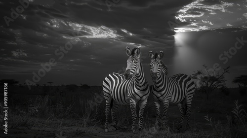 © TYNQ, Fototapeta premium Two zebras stand in tall grass against a dramatic, stormy sky.