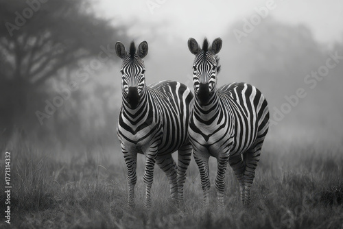 © Kim, Fototapeta premium Two zebras stand side by side in misty field, calm and watchful gaze evident