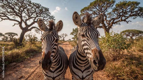 © Lasvu, Obraz premium Two zebras standing on a dirt road under trees in a savanna landscape.