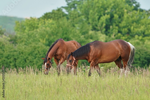 © Monikasurzin, Obraz premium Twobrown hrorse graze on the meadow.