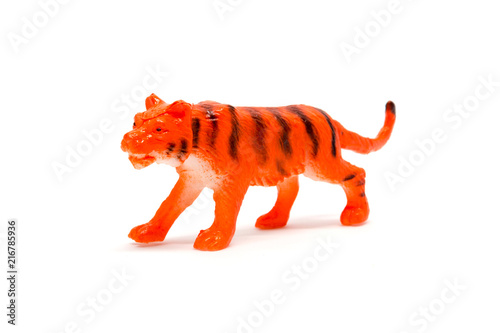 © Noey smiley, Fototapeta premium Tygrys model na białym tle, plastikowe zabawki zwierząt