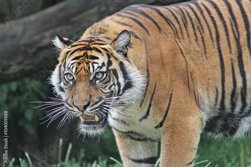 © milka-kotka, Naklejka premium Tygrys sumatrzański ryczy w warszawskim zoo. Zbliżenie.