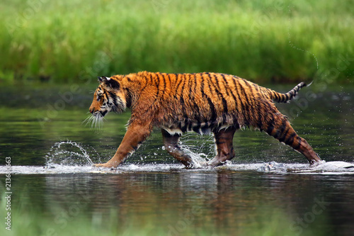 © Karlos Lomsky, Fototapeta premium Tygrys syberyjski (Panthera tigris tigris), zwany także tygrysem amurskim (Panthera tigris altaica), spaceruje po wodzie. Piękna samica Tygrys syberyjski w ciepłe lato.