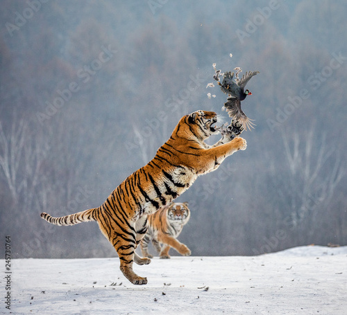 Fototapeta premium Tygrys syberyjski w skoku łapie swoją zdobycz. Bardzo dynamiczny strzał....