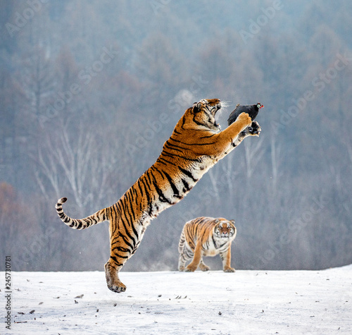 Fototapeta premium Tygrys syberyjski w skoku łapie swoją zdobycz. Bardzo dynamiczny strzał....