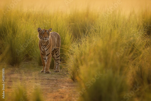 © photocech, Fototapeta premium Tygrys w pięknym złotym świetle w Parku Narodowym Ranthambhore w Indiach, panthera tigris, królewski tygrys bengalski, indyjska dzika przyroda, tygrysica, samica, imię t-83 błyskawica