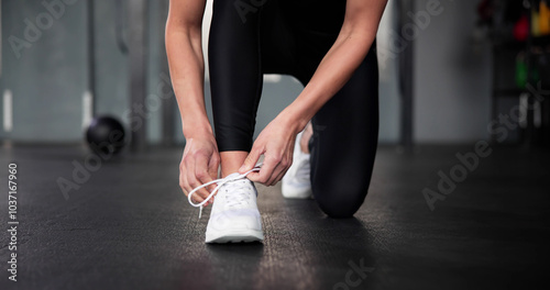 © Andrey Popov, Naklejka premium Tying Running Fitness Shoes
