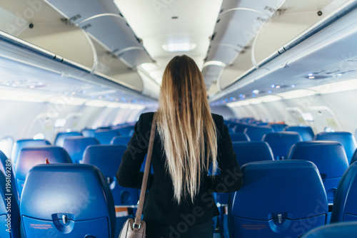 © undrey, Naklejka premium Tylny widok jest ubranym formalnego kostium chodzi naw na samolocie młoda kobieta