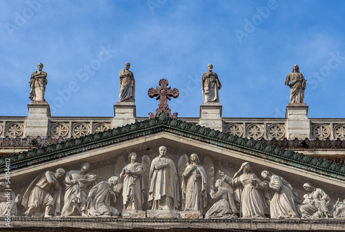 © Bruno, Fototapeta premium Tympanum and the statues of the church of Saint Vincent de Paul on a sunny day (blue sky), Paris, France.