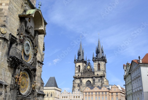 © louizaphoto, Obraz premium Tyn church and astronomical clock with blue sky