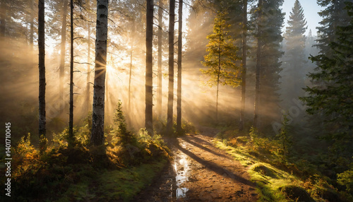 Fototapeta premium Tyndall Effect Sunbeams in Misty Forest at Dawn.