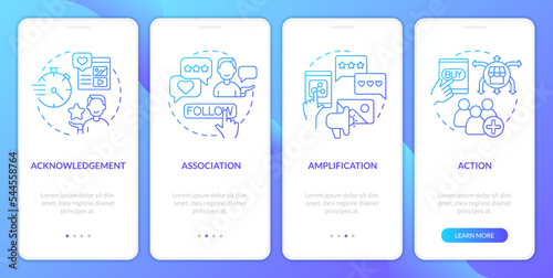 Fototapeta premium Types of social media interaction blue gradient onboarding mobile app screen. Walkthrough 4 steps graphic instructions with linear concepts. UI, UX, GUI template. Myriad Pro-Bold, Regular fonts used