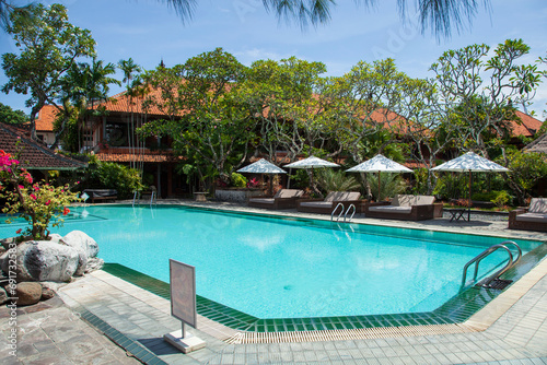 Obraz premium Typical Balinese swimming pool at a resort in Sanur, Bali with traditional...