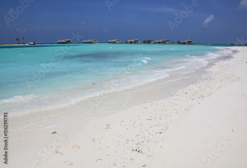 Obraz premium Typical bungalows on piles with white coral sand beach on foreground