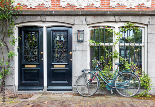 Obraz premium Typical house entrance with two doors, window, and bicycle in the old town of Amsterdam, Netherlands