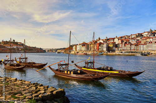 Obraz premium Typical portuguese wooden boats, called "barcos rabelos" transporting wine...
