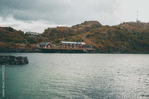 Fototapeta premium Typical red wooden houses at the harbor, on the Lofoten Islands in Norway - during an beautiful autumn day