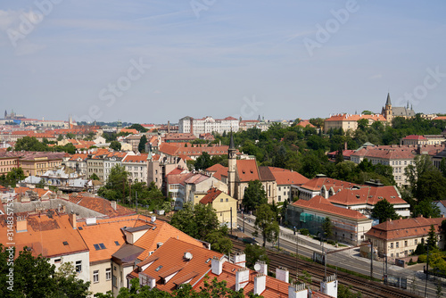 © EverGrump, Obraz premium Typical roofs. Top view - roofs with red tiles in old buildings. There are beautiful houses in green trees. Horizontal photo colorful European city Prague in Czech Republic, travel in tourist place