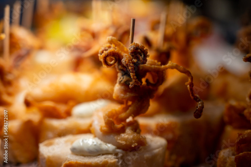 Fototapeta premium Typical snack of Basque Country, pinchos or pinxtos skewers with small pieces of bread, sea food, baby octopus, cheese, jamon served in bar in San-Sebastian or Bilbao, Spain