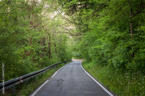 Naklejka premium Typical spring landscape with a paved road in the middle of a deep forest and trees with green colors during the spring season, with their foliage, in a European rural environment...