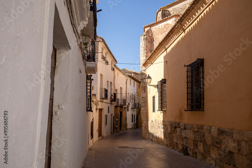 © AntonioLopez, Fototapeta premium Typical street of the medieval old town of Requena, Valencian Community, Spain, with its whitewashed houses in summer