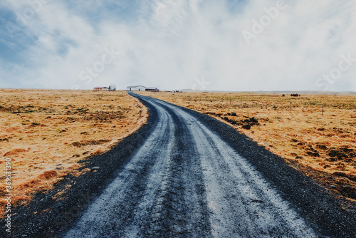 Fototapeta premium Typical turf-top cottage house in Icelandic countryside. Wooden house with grass roof in Iceland, Traveling concept background.