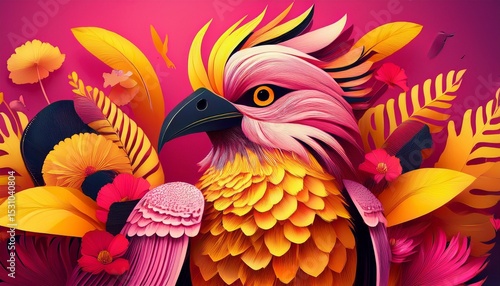 Naklejka premium typographic layouts featuring large birds and bold letter forms in vibrant pink and yellow contrasts for system launch and editorial display