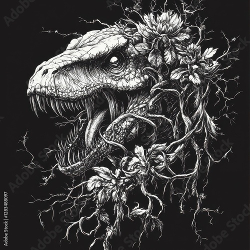 Fototapeta premium Tyrannosaurus Rex with Floral Crown Skull Fossil Art Black and White Illustration Deadly Jurassic Predator