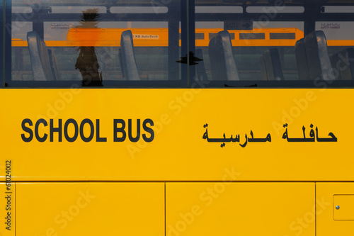 © Sophie James, Fototapeta premium UAE, Middle East: A close-up view of a yellow Arabic school bus