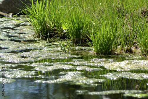 © Nicola, Fototapeta premium Ufergräser und grüne Algen, Nahaufnahme