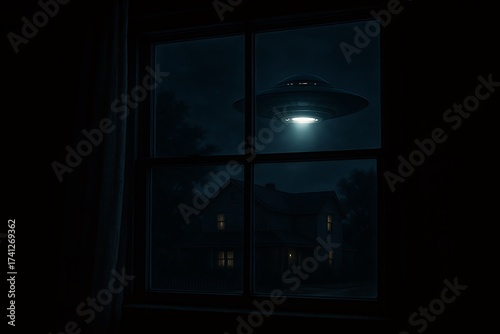 Obraz premium UFO Hovering Over House at Night Seen Through Window