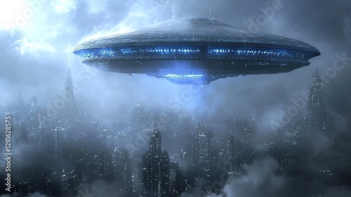© QuietWord, Fototapeta premium UFO in style of retrofuturism with light glowing