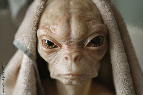 © Tetiana, Fototapeta premium UFO space visitor alien on Earth living human life with everyday routine staff, Generative AI